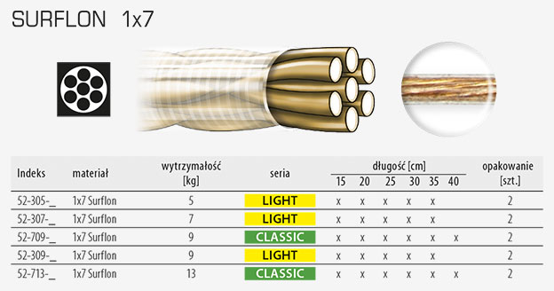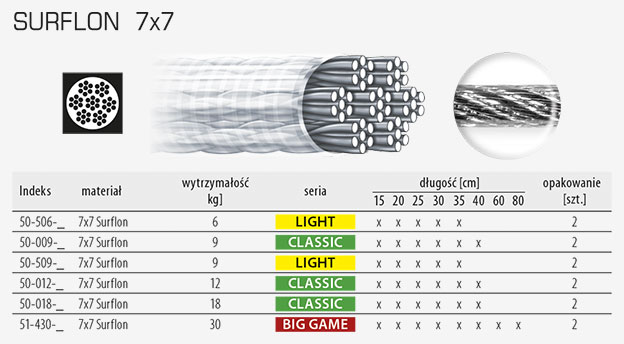 Przypony CLASSIC: Classic to podstawowa, najbardziej dopasowana do przeciętnych warunków połowu seria naszych przyponów spinningowych. Perfekcyjnie wykonane z najwyższej jakości materiałów takich jak Surflon, Surfstrand, Titanium Braid, Titanium Wire i Fluorocarbon Invisible, zaopatrzone zostały w doskonałe agrafki polskiej produkcji z serii Dragon Spinn Lock i amerykańskie krętliki typu Rolling Swivel.