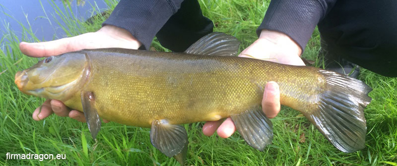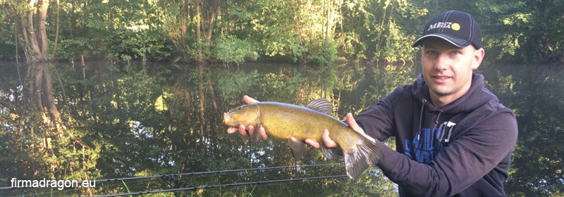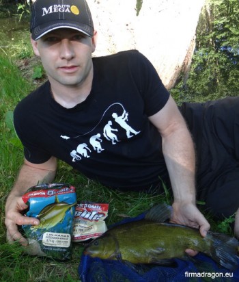 Gdy zanęta ma lądować na bardzo ciemnym dnie, a tak było w tym przypadku, mieszankę zabarwiam czarnym barwnikiem lub znacznie częściej ziemią bełchatowską. Na bardzo wymagających łowiskach warto pomyśleć o korzystaniu z żyłek w kolorze zbliżonym do koloru dna. Przed rozpoczęciem wędkowania, w łowisko podałem około 6 koszyków z mieszanką. Uczyniłem to bardzo precyzyjnie. Pomagają mi w tym kołowrotki Dragona, które posiadają duraluminiowe klipsy. To ogromny komfort podczas łowienia z użyciem cienkiej żyłki. Z klipsami Dragona nigdy nie miałem problemu, gdyż zostały tak przemyślnie wykonane, że nie uszkadzają żyłki. Są prawdziwym dobrodziejstwem dla feederowca. Jako przynętę użyłem białego robaka założonego na mocny hak w rozmiarze 16. Na pierwsze branie nie czekałem długo. Szybkie zacięcie i jest pierwsza rybka. Niestety, była to wszędobylska płotka. Po kilku takich holach płotek nastała cisza, jak się wkrótce okazało, była to cisza przed burzą. Po 10 minutach bez brania nagle szczytówka wędki wygina się bardzo mocno, wykonuję zacięcie i od razu poczułem większą rybkę. Po emocjonującym holu do podbieraka trafił 45-centymetrowy lin. Mimo, że wędkowanie rozpocząłem niedawno był już taki nażarty zanętą i robakami, że nimi wymiotował. Tego dnia jeszcze udało mi się złowić kilka ryb, w tym jeszcze jednego lina oraz całkiem ładnego leszcza. Podczas łowienia linów ogromną rolę odgrywa mieszanka zanętowa. Pomysł kozieradkowej zanęty Dragona to prawdziwy strzał w dziesiątkę. Mieszanka z jednej strony jest słodka - podbija ją słodki biszkopt i wanilia, z drugiej - przełamana kozieradką, która jak dla mnie przypomina smak niedzielnego rosołu doprawionego obficie przyprawą Maggi. Ta kompozycja idealnie pasuje linom i sprawia, że w łowisku pojawiają się nawet wtedy, gdy wyrwiemy się w domu na krótką, trzygodzinną sesję linową.
