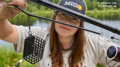 Zestawy początkowo zmontowałam przelotowo, co w miarę obserwacji modyfikowałam. W wędzisku Magnum Ti Feeder 80 zastosowałam koszyk typu methoda (Dragona) na żyłce Team Dragon Ultra średnicy 0,22 mm, a drugą wędkę Elite Pro Feeder uzbroiłam klasycznie w koszyczek Dragona na rurce antysplątaniowej, gdzie zastosowałam przypon długości 30 cm i średnicy 0,20 mm, z żyłką główną 0,23 mm Specialist Pro Match & Feeder. Obciążenie bez zanęty wynosiło 25 g. Oba zestawy dopełniały wysokiej jakości i bardzo ostre haki, a mianowicie z szerokim kolankiem i krótkim trzonkiem marki Mega Baits z serii Kuwase Gure EC00101BN LineGrip w rozmiarze 10.