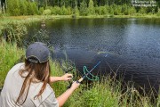 Jeszcze z rana, w oczekiwaniu na kompana tej wyprawy, Pana Waldemara, pośpiesznie rozłożyłam odległościówkę i położyłam rosówkę na dnie. Gdy jednak słońce ukazało swe oblicze wszelka aktywność jakby zanikła. Na ratunek przybył prekursor tego wyjazdu – Pan Waldek Ptak z całym orężem od Dragona. Zmontowaliśmy zestawy, wybrałam dla siebie i przygotowałam zanętę i… zaczęliśmy tę nierówną walkę z warunkami atmosferycznymi. Zakończeniem miała być gwałtowna nawałnica, która opadając chciała zmącić panującą przed burzą ciszę. Na szczęście zareagowaliśmy z wyprzedzeniem i w porę, jeszcze przed zmierzchem, zwinęliśmy zabawki ucierając nosa pogodzie!