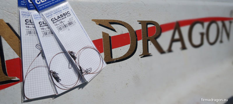 Kolejnym bardzo ważnym elementem zestawu, który używam od długich lat, to przypony Dragona. Używam wszystkie serie, począwszy od Big Game do standardowej serii Classic. Przypony Classic to podstawowa, najbardziej dopasowana do przeciętnych warunków połowu seria przyponów spinningowych. Perfekcyjnie wykonane z najwyższej jakości materiałów takich jak Surflon, Surfstrand, Titanium Braid, Titanium Wire i Fluorocarbon Invisible, zaopatrzone w doskonałe agrafki polskiej produkcji i amerykańskie krętliki typu Rolling Swivel. Całość wykończona najwyższej jakości zaciskami wykonanymi z brązu, które znakomicie spinają wszystkie elementy oraz są na tyle elastyczne by nie kaleczyć i nie osłabiać użytego do ich wykonania materiału przyponowego. Z serii Classic do połowu szczupaków używam przypony o wytrzymałości do 18 kg oraz długości do 40 cm.