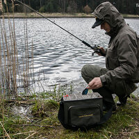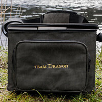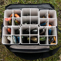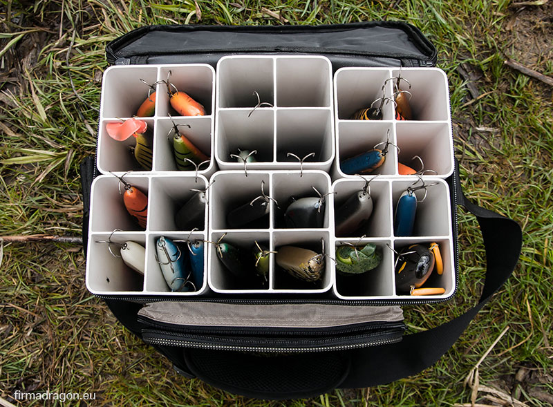 Oprócz samego wędziska oraz multiplikatora z nawiniętą nań dobrą i wytrzymałą plecionką, musieliśmy wyposażyć się w odpowiednie akcesorium, będące w stanie pomieścić dużą ilość sporych przynęt. Wszelkie pudełka odpadały, ponieważ i tak trzeba by było wybrać duże rozmiary, a następnie umieścić je w dużej torbie. Na szczęście bardzo szybko znaleźliśmy rozwiązanie, a dokładnie specjalistyczną torbę na duże przynęty: Team Dragon kod: 96-17-006. Wybór okazał się przysłowiowym strzałem w dziesiątkę. Niepozornie wyglądająca na pierwszy rzut oka torba jest w stanie pomieścić naprawdę sporą ilość dużych przynęt. Dzięki specjalnie zaprojektowanym przegrodom z tworzywa, dżerki nie rysują się, a kotwice nie tępią. Dodatkowo producent zrezygnował z zamkniętego dna, zastępując go siatką przepuszczającą powietrze. Dzięki niej nasze wabiki schną szybciej, bez konieczności ich wyjmowania. Torba posiada regulowany pasek na ramię oraz dwie dodatkowe kieszenie, w których możemy przechowywać chociażby przypony, zapasowe kółka łącznikowe czy też inne niezbędne akcesoria.