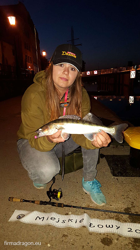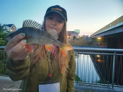 Zaczęłam przygodę od grążeli rosnących wzdłuż wysokiego brzegu. Już na starcie w pierwszym rzucie na końcu zestawu zameldował się krótki szczupaczek. Coś się działo. W miarę posuwania się naprzód dno Motławy było coraz bardziej zarośnięte. Zmieniłam przynętę na obrotówkę, lecz bez efektu. Zaczęłam więc poszukiwanie twardego dna i gdy tylko namierzyłam kamienie rozpoczęłam opukiwanie ripperkiem o drobnej pracy na lekkiej główce Mustad Micro Ultra Point. Ku mojej uciesze trafiłam pierwszą wymiarową rybę, którą mogłam wpisać w kartę. Niestety nie nacieszyłam się miejscówką zbyt długo, gdyż po chwili zbiegli się koledzy i zostałam zmuszona do dalszych poszukiwań. Kolejne miejsce z kamienistym dnem dało następnego „stykowca”, lecz niestety tylko jednego. Po dłuższym bezowocnym wędkowaniu nad roślinnością wróciłam w poprzednie miejsca. Dołowiłam okonka, któremu niestety zabrakło pół centymetra do punktacji. Zaczęłam się cofać tak by o zmierzchu móc jeszcze pomachać kijem Team Dragon Z-series o długości 2,28 m i c.w. 7-25 g. W planie były sandacze. Udało mi się jeszcze z mojej pierwszej miejscówki dołowić okonia 24 cm i na tym zakończyłam pierwszą turę zawodów, gdyż sandacze nawet nie myślały przed północą podjąć ze mną współpracy.