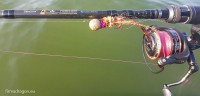 Na początku zaczynam standardowo, czyli od przynęt gumowych V-Lures; przez 20 minut spinningowania nie mam kontaktu z rybą. Myślę sobie: Trochę to niemożliwe, zawsze tutaj o tej porze były ryby i szły na gumy. Hm, coś muszę wymyślić… Analizuję sytuację i dochodzę do przekonania, że ryby na pewno są, tylko trzeba je skusić. Dobra, mam plan: sięgam po moją ukochaną legendarną już wędkę FC-X FastCast do 35 g, jest uzbrojona w kołowrotek Fishmaker Ti 1135 i plecionkę Jiggin' Braid - to jest mój ulubiony zestaw sandaczowy na tę wodę. Decyduję się na założenie koguta, w myśl zasady „a czemu by nie spróbować?” i już po chwili melduje się sandacz długości blisko 60 cm.