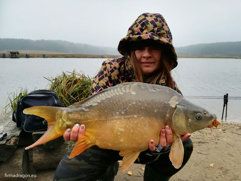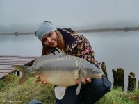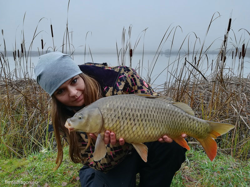 Znajduję dla nich czas szczególnie późną jesienią i wczesną zimą, tuż przed przykryciem jeziora lodową pokrywą. Wtedy każda wyholowana sztuka niewiarygodnie cieszy. Jest to bardzo przyjemny okres gdyż cenię sobie ciszę i spokój na łowisku, do których zdążyłam już przywyknąć wędkując od lat na moich mazurskich akwenach. Nierzadko jestem na łowisku sama mając je całe do swej dyspozycji. Nie lubię przeludnienia zarówno biorąc pod uwagę leśne jeziorka jak i łowiska komercyjne. Wracając do karpi. Lubię, gdy zestawami regularnie coś się interesuje. Uwielbiam obserwować rybie zachowania i mogę z duszą na ramieniu stwierdzić, że karpie są niezwykle mądrymi przedstawicielami zmiennocieplnych kręgowców wodnych. Uczą się różnych zachowań i nierzadko ciężko je przechytrzyć. Wędkarski sezon nigdy się nie kończy i jedynie do warunków trzeba się dostosować. Tak jak dla wędkarza ważne jest co założy na siebie, tak jeszcze ważniejsze jest co zaserwuje rybom i w jaki sposób. Woda jest zimna, a ryby lubią zjeść treściwie i przy tym nie stracić wiele energii. Korzystam więc z wysokiej jakości pelletów, które częściowo mielę na pył i wykorzystuję jako dodatek zanętowy. Z uwagi na delikatne brania wybieram methodę, która serwuje przynętę w zanęcie, odpowiednio ją eksponując i zwiększając szansę na sukces nawet przy słabym żerowaniu. Wykorzystanie drgającej szczytówki do łowienia karpi nie jest też przypadkowe - pomijając już fakt, że jest to moja ulubiona metoda połowu. Głównym kryterium wyboru jest finezja, która objawia się zarówno w holu, ale również, i to w szczególności, w trakcie samego brania. Zimny karp jest wspaniałym przeciwnikiem. Sprowokowanie ryby do brania w wodzie o temperaturze ok. 5 stopni Celsjusza to już połowa sukcesu, zwłaszcza wtedy, gdy temperatura powietrza nierzadko oscyluje w okolicach zera.