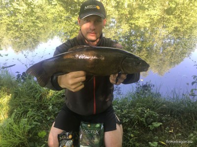 Po pierwszym zarzuceniu zestawu od razu na szczytówce pokazały się wskazania świadczące o obecności ryb. Po zacięciu brania na brzegu lądowałem niewielką płoć. Scenariusz powtórzy się kilkanaście razy. Wtedy też myślałem, że w wodzie nie pływają raczej żadne większe ryby. Po „nastym” zarzuceniu zestawu z koszyczkiem, po bardzo delikatnym braniu na wędce zaczęła szaleć jakaś duża ryba. Walczyłem z nią dobrych kilka minut. Wędka TACTIX dzielnie spisywała się w walce podczas holu, a także sprawnie lądowała rybę na brzegu. Pięknie amortyzowała wszystkie jej zrywy. Nie poddała się także w chwilach siłowego holu, kiedy potencjalna „zdobycz” chciała schować się w szuwarach lub zatopionych gałęziach. Koniec końców na brzegu zameldował się piękny lin mierzący 55 cm.