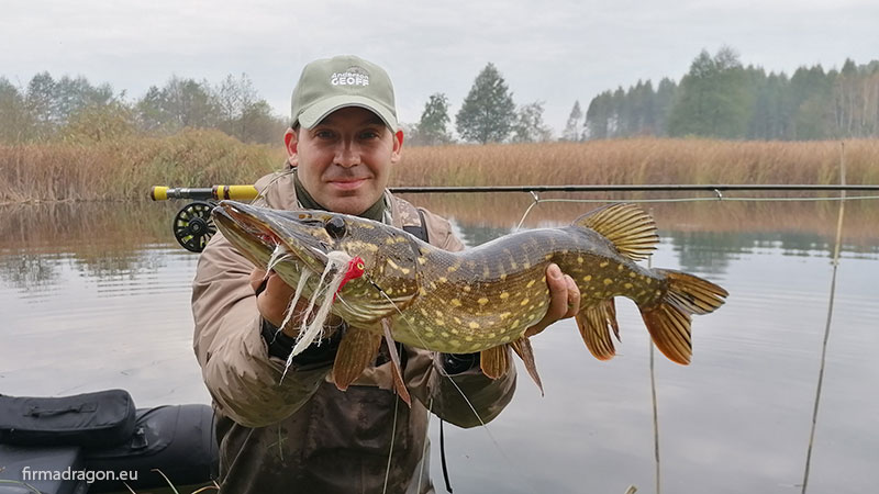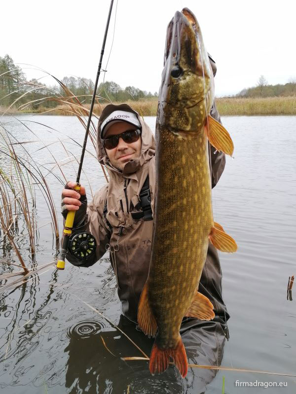 Mówiąc o przyponach szczupakowych mam na myśli wyłącznie najgrubsze średnice w ofercie fluorocarbonu. Podczas ostatniej wizyty nad wodą, miałem nadzwyczajne branie szczupaka dosłownie w samych płetwach, gdy żwawo płynąłem przez środek zbiornika na moim pływadełku. Wyglądało to tak, jakby ryba płynęła za mną od jakiegoś czasu i tylko czekała, że coś jej wpadnie na ząb. Takiej agresji na końcu zestawu dawno nie widziałem. Szczupak zażarł muchę głęboko, z ogromnego pyska wystawała mu połowa mojego przypony z fluorocarbonu. Czułem i widziałem, jak przekłada po zębach przypony z lewej na prawą. Momentami sznur był tak napięty, że można było grać na nim jak na gitarze! I co? I nic! Ryba szczęśliwie wylądowała w podbieraku. Mierzył 92 cm. Z tym samym przyponem łowiłem jeszcze przez resztę dnia.