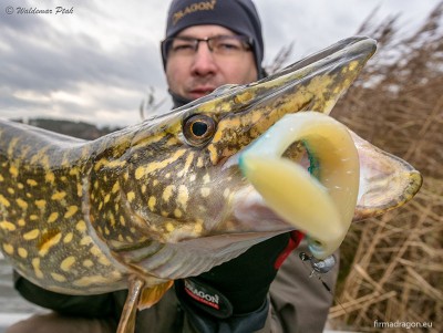 Godziny mijały, a nam udało się dołowić trzy wymiarowe szczupaki, niestety ich wielkość nie przekonała Waldemara do użycia jego drogocennego sprzętu fotograficznego. Co ciekawe, wszystkie złowione ryby skusiły się na przynęty z akcentem seledynowym. Gdy już lekko zziębnięci, obwiani i - nie ma co ukrywać - podłamani brakiem choćby brania przyzwoitej wielkości ryby na sam koniec w akcie desperacji postanawiamy obłowić nawietrzną część trzcinowiska, a do boju posyłamy 15-centymetrowego Chucky. I jak zwał mawiać trener Górski mecz trwa, dopóki piłka w grze, tak i w wędkarstwie niejednokrotnie zdarzało się łowić ryby podczas spływania do portu. Tak oto na wędce Waldemara na - o dziwo - błękitnego Chucky'ego zameldował się wspaniały kwadratowy wręcz krokodyl. Rzadko widywałem szczupaki tej wielkości o takim kształcie ciała, ten szczupak był równie szeroki jak i wysoki.