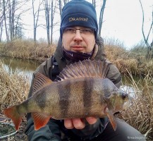 Głównym celem były jazie i klenie, a że te gatunki łowię w zasadzie na te same przynęty, to też pierwszymi przynętami na wędce były obrotówki w rozmiarach 00 i 0 oraz ręcznie wykonane woblerki mikruski. Z uwagi na niesprzyjający wiatr i niewielką wagę przynęt oraz brak jakichkolwiek oznak życia w rzece, po ok. godzinie postanawiam zmienić przynęty twarde na gumki. Spotkani tego dnia spinningiści (a było ich sporo) nie mieli dla mnie dobrych wieści, od kilku dni ciężko było nie tylko o okonia, ale jak już się dowiedzieli nawet białoryb jakoś słabiej zaczął żerować. No cóż, kolejne setki metrów w nogach i kilometry przewiniętej żyłki, na wędce zagościły już różne twisterki i kopytka i wydawało mi się, że ten dzień uratować może już tylko gorąca kawa. Wracając do samochodu postanowiłem zatrzymać się jeszcze na chwilę w miejscach już wcześniej przeczesanych. Otwierałem posiadane pudełka i główkowałem co też założyć na wędkę. Jak się rychło okazało, ostatnią deską ratunku były Belly Fish na główkach jigowych V-Point X-FINE. Przynęty te nie tylko otworzyły wodę, ale także - co udało mi się zaobserwować - również pudełka wędkujących obok spinningistów i choć może nie złowiłem nie wiadomo ile ryb, to jako jedyny regularnie w odstępach kilkuminutowych holowałem przyzwoitej wielkości okonie.